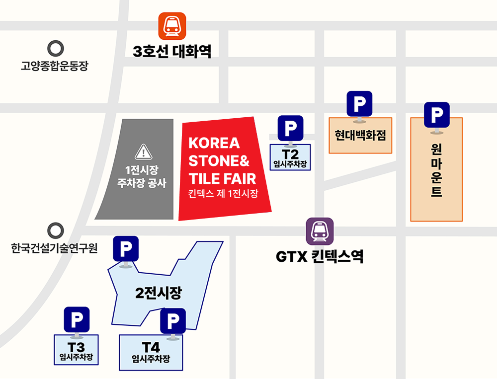 현재 킨텍스 3전시장 건립 공사로 인해 킨텍스 1전시장 주차장 이용이 중단되었습니다. 방문시 대중교통 혹은 아래 주차장을 이용하시는 것을 권장드립니다.